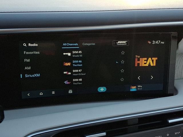 - Radio: Infotainment Navigation System -inc: Bose 14-speaker premium audio system w/Centerpoint and SoundTrue enhanced technology, 12.3" color touchscreen, wireless Apple CarPlay and Android Auto, HD Radio, Sirius XM, Passenger Talk 2.0 in-car intercom system, dynamic voice recognition, rear seat quiet mode, Bluetooth® hands-free w/wireless audio streaming, multiple device connection (up to 2 devices), USB connectivity, Bluelink + connected car services, Wi-Fi hotspot, steering wheel audio controls and Over-the-Air (OTA) software updates