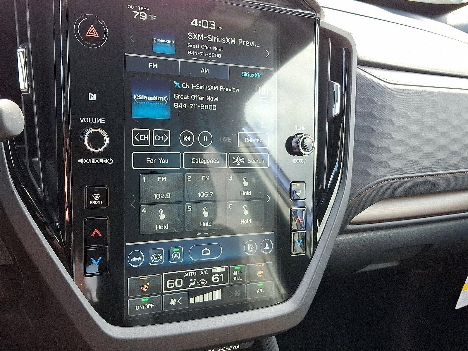 - Radio: Subaru 11.6" Multimedia Plus System -inc: valet mode, integrated center information display, AM/FM stereo HD Radio, multi-touch gesture high resolution display screen, voice activated controls, Bluetooth® audio streaming and hands-free phone connectivity w/SMS text messaging (refer to Subaru.com for cellphone compatibility), iPod control capability, smartphone integration: Android Auto and Apple CarPlay w/full screen view and wireless connection, SiriusXM satellite radio w/360L (free 4-month trial subscription included), USB and Over The Air (OTA) audio system update, steering wheel controls, 6 speakers, 3.5mm auxiliary input jack and roof mounted audio and satellite antenna